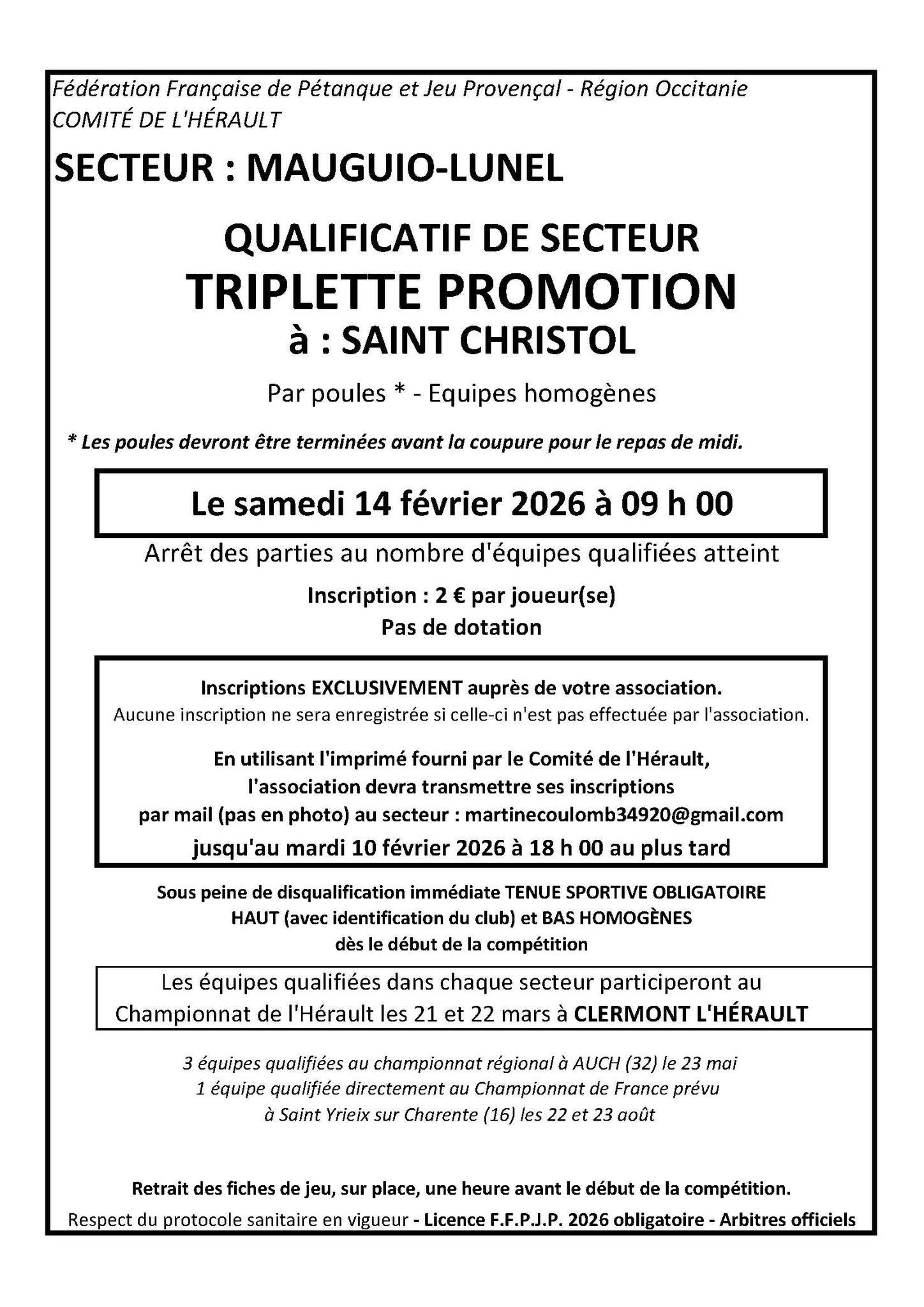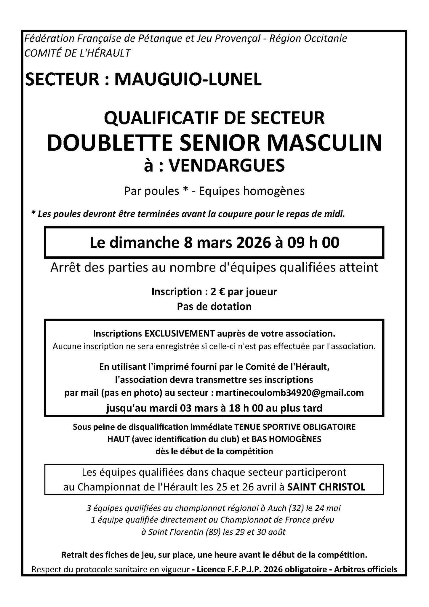 – Le Qualif doublette masc est reporté au 17 avril puis au dimanche 19 en cas d’intemperie a Vendargues